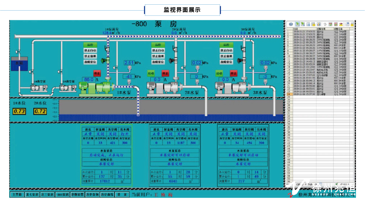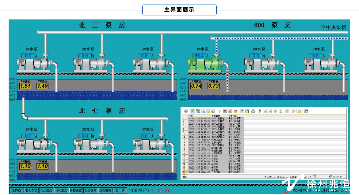 基于能效優化的原則,本系統設計了水泵自動輪換工作制,控制程序將水泵啟停次數及運行時間等參數自動記錄并累計,系統根據這些運行參數按一定順序自動啟停水泵和相應管路,使各水泵及其管路的使用率分布均勻,當某臺泵或所屬閥門故障,系統自動發出聲光報警,并在上位機上記錄事故,同時將故障泵或管路自動退出輪換工作,其余各泵和管路繼續按一定順序自動輪換工作,以達到有故障早發現、早處理,以免影響礦井安全生產。