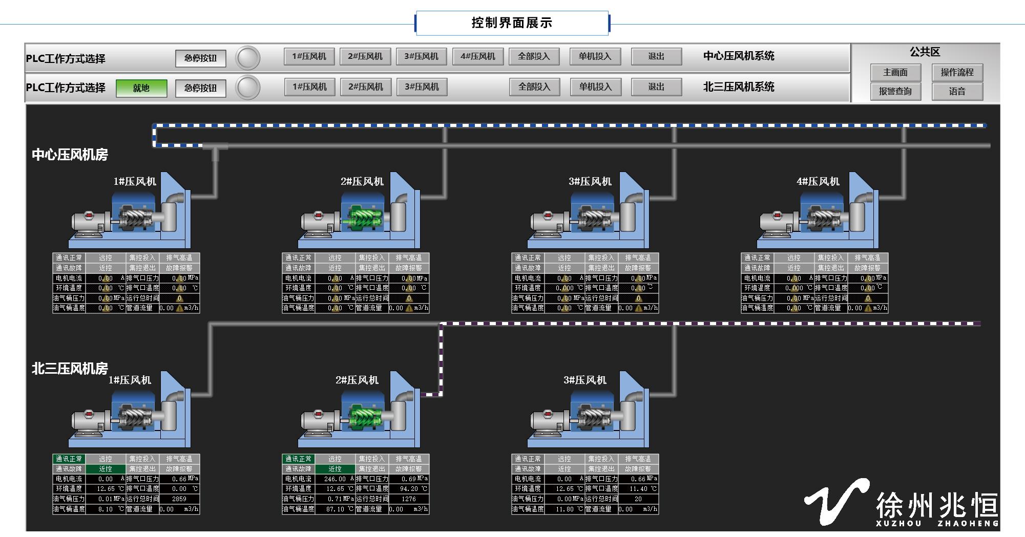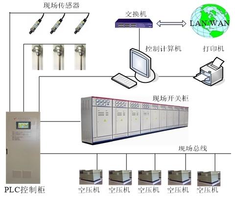 壓風(fēng)機(jī)能否安全、可靠、高效的運(yùn)行,涉及到整個(gè)礦井安全生產(chǎn)和經(jīng)濟(jì)效益。目前,我國(guó)煤礦壓風(fēng)機(jī)系統(tǒng)主要采用人員值守、定期巡視、定期檢修、定期切換風(fēng)機(jī)的方式,這種方式無(wú)法及時(shí)發(fā)現(xiàn)壓風(fēng)機(jī)系統(tǒng)潛在的危險(xiǎn),甚至出現(xiàn)緊急情況下不能及時(shí)送風(fēng)、壓風(fēng)機(jī)帶病運(yùn)行現(xiàn)象。我公司根據(jù)生產(chǎn)過(guò)程中的實(shí)際需求,運(yùn)用計(jì)算機(jī)監(jiān)測(cè)和PLC技術(shù),研發(fā)了一套地面壓風(fēng)機(jī)遠(yuǎn)程監(jiān)控系統(tǒng)。